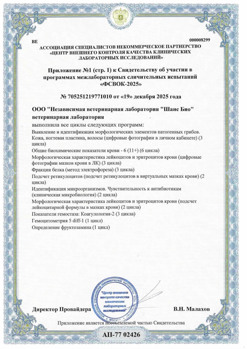 Лаборатория "Шанс Био" имеет Лицензии на работу с возбудителями инфекционных заболеваний человека и животных, на работу с источниками ионизирующих излучений, на фармацевтическую деятельность и аккредитована в Росаккредитации по стандартам ГОСТ ISO/IEC 17025-2019. Лабораторные услуги сертифицированы. Разъяснения по областям лицензирования, сертификации и аккредитации могут быть получены в Лаборатории или в соответствующих ведомствах.