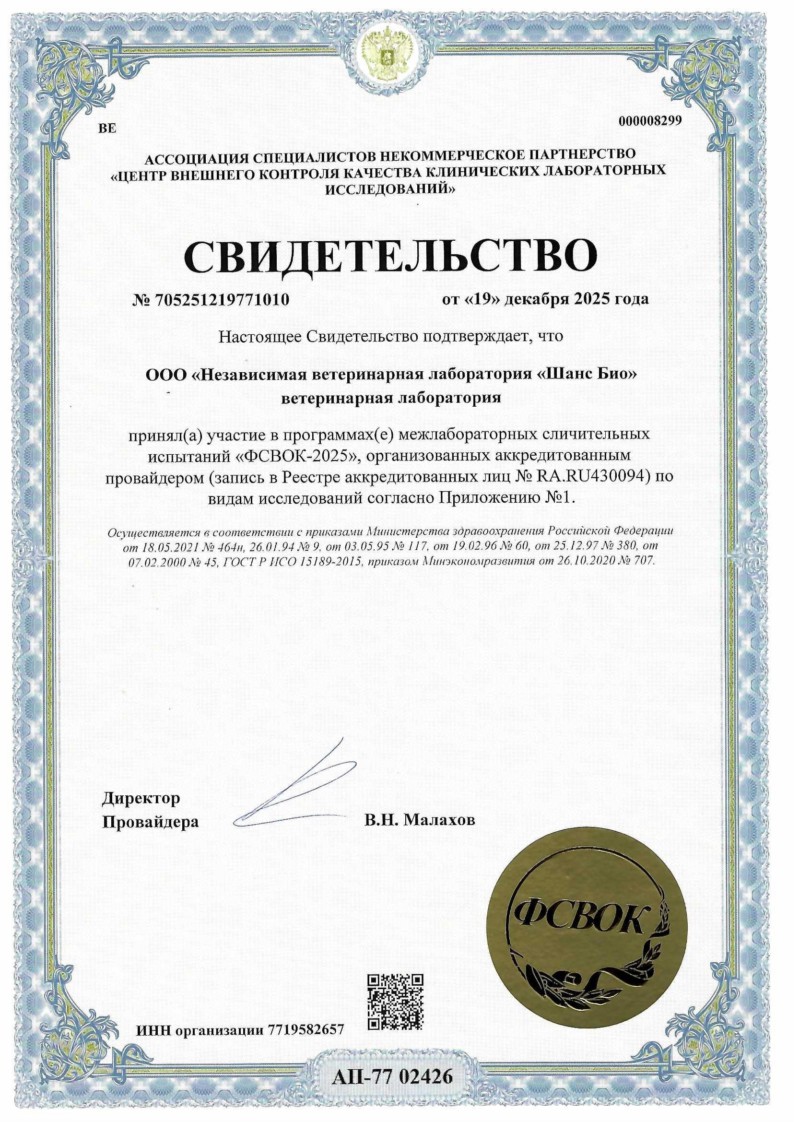 Лаборатория "Шанс Био" имеет Лицензии на работу с возбудителями инфекционных заболеваний человека и животных, на работу с источниками ионизирующих излучений, на фармацевтическую деятельность и аккредитована в Росаккредитации по стандартам ГОСТ ISO/IEC 17025-2019. Лабораторные услуги сертифицированы. Разъяснения по областям лицензирования, сертификации и аккредитации могут быть получены в Лаборатории или в соответствующих ведомствах.